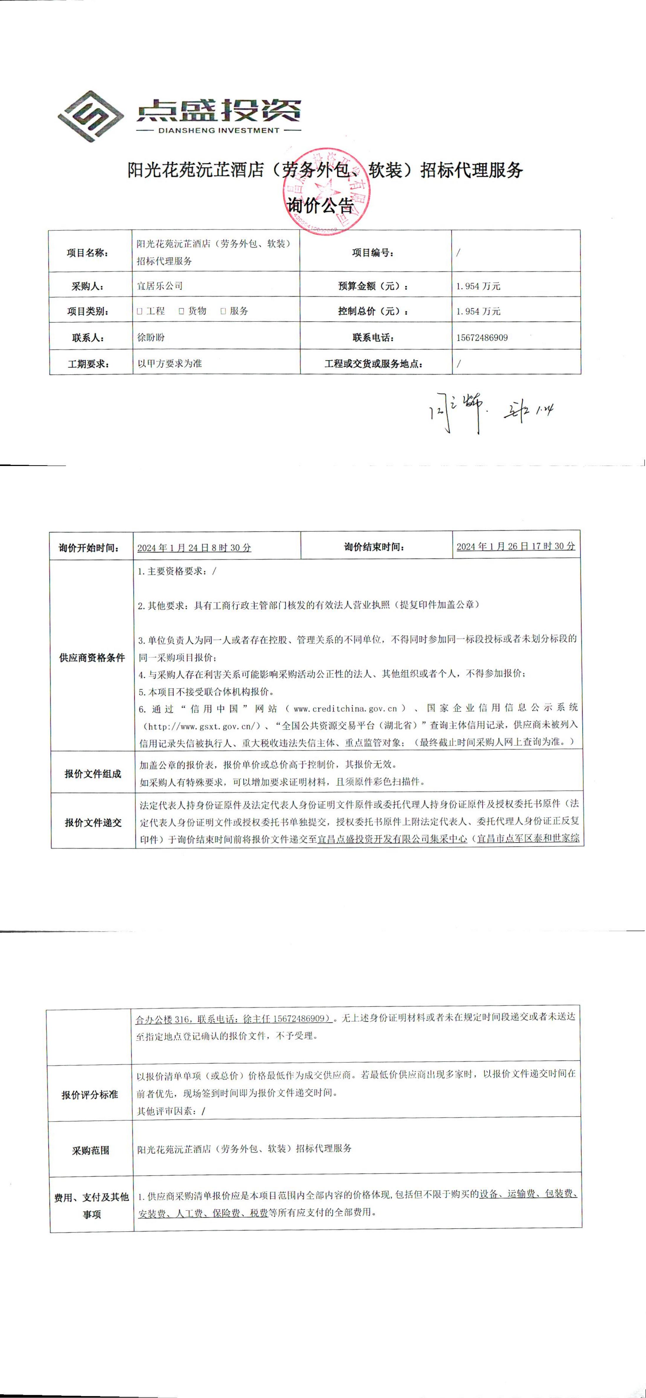 陽(yáng)光花苑沅芷酒店(勞務(wù)外包、軟裝)招標(biāo)代理服務(wù)?詢價(jià)公告