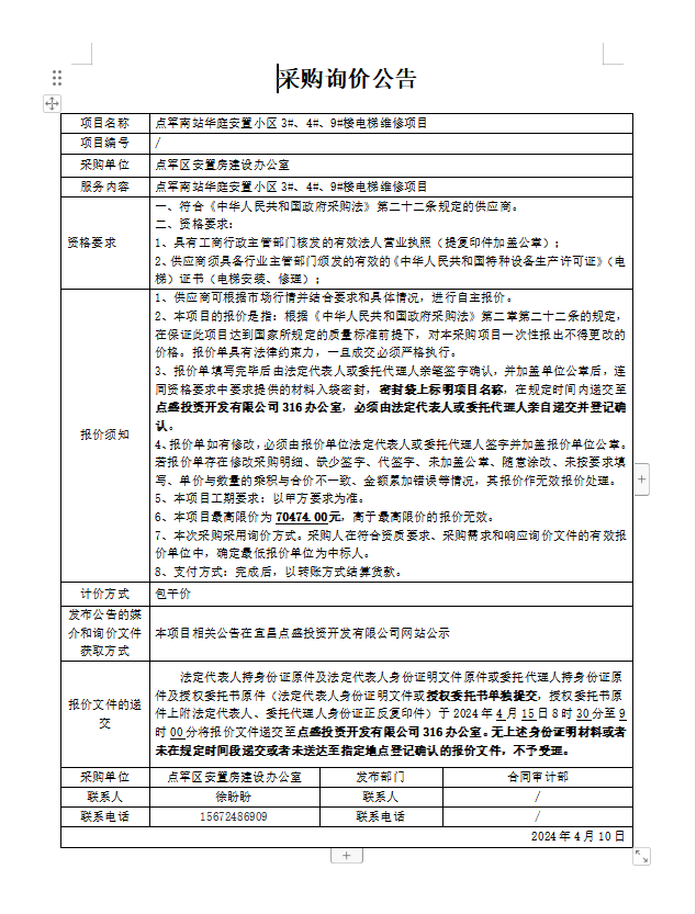 點軍南站華庭安置小區3#、4#、9#樓電梯維修項目詢價公告