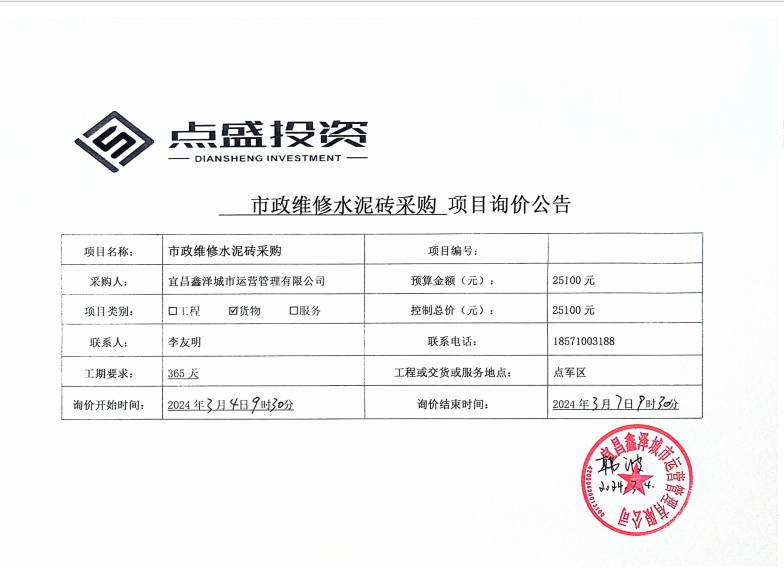 宜昌鑫澤城市運營管理有限公司市政維修水泥磚采購項目詢價公告