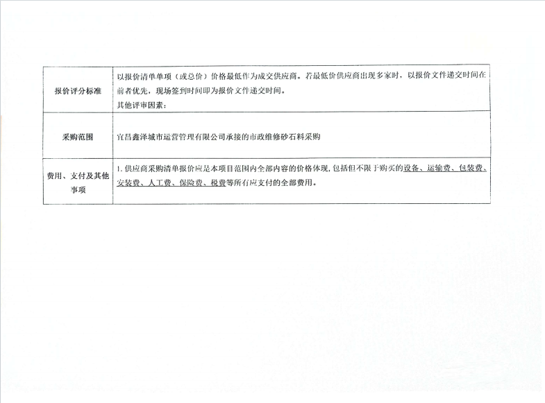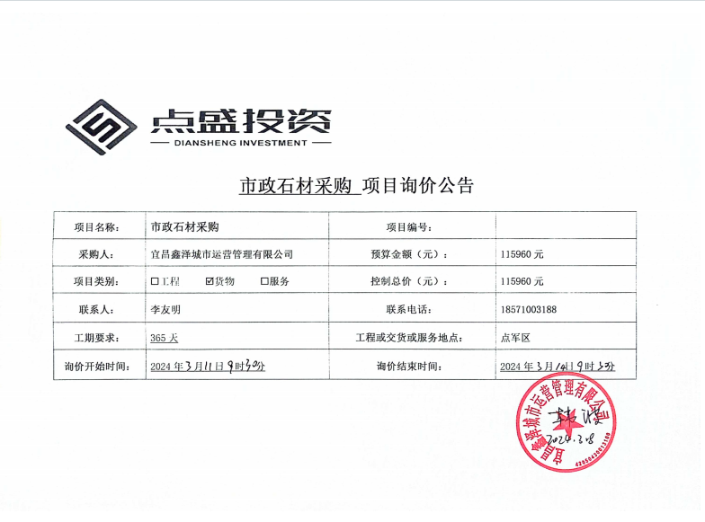 宜昌鑫澤城市運(yùn)營管理有限公司市政維修石材采購項(xiàng)目詢價(jià)公告