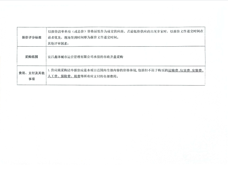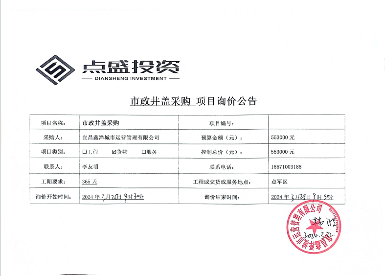 宜昌鑫澤城市運營管理有限公司市政井蓋采購項目詢價公告