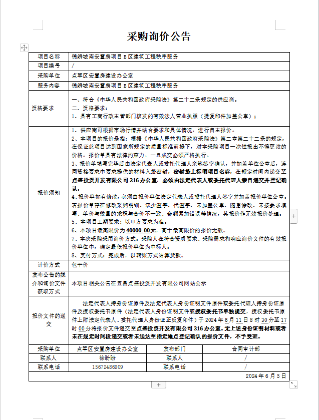 錦繡城南安置房項目B區建筑工程秩序服務詢價公告