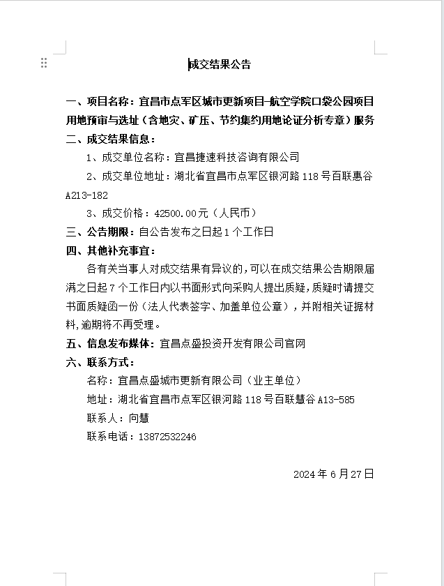 宜昌市點軍區城市更新項目-航空學院口袋公園項目用地預審與選址(含地災、礦壓、節約集約用地論證分析專章)服務 成交公告