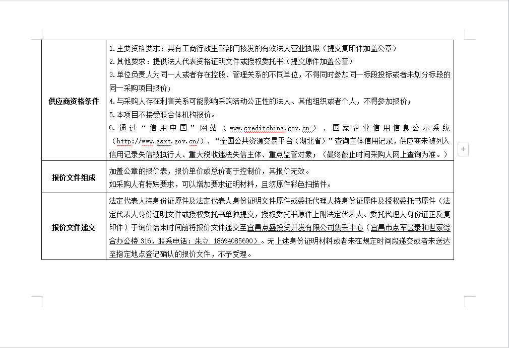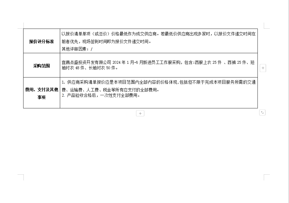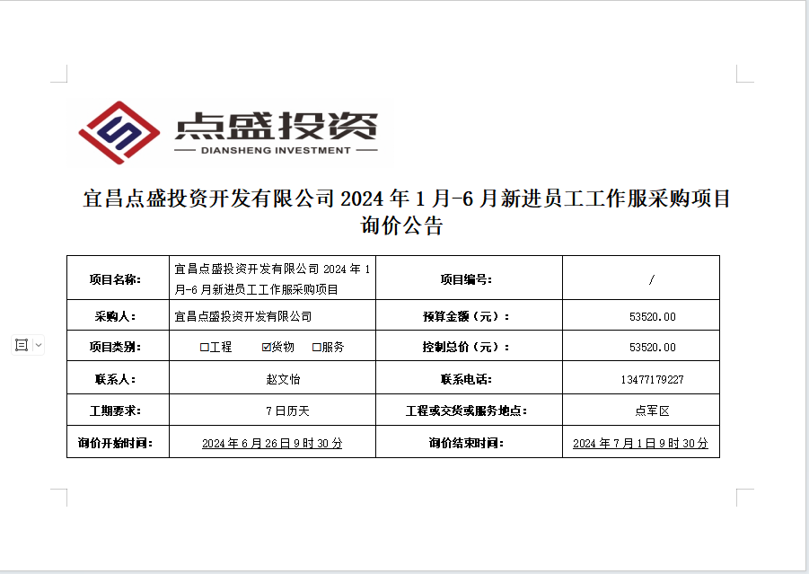宜昌點盛投資開發有限公司2024年1月-6月新進員工工作服采購項目詢價公告