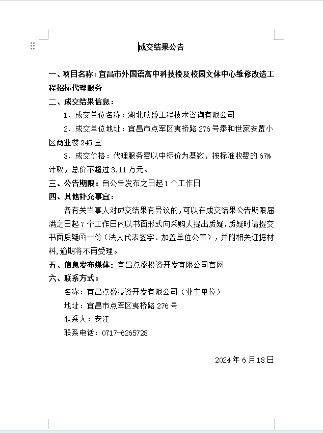 宜昌市外國語高中科技樓及校園文體中心維修改造工程招標代理成交公告