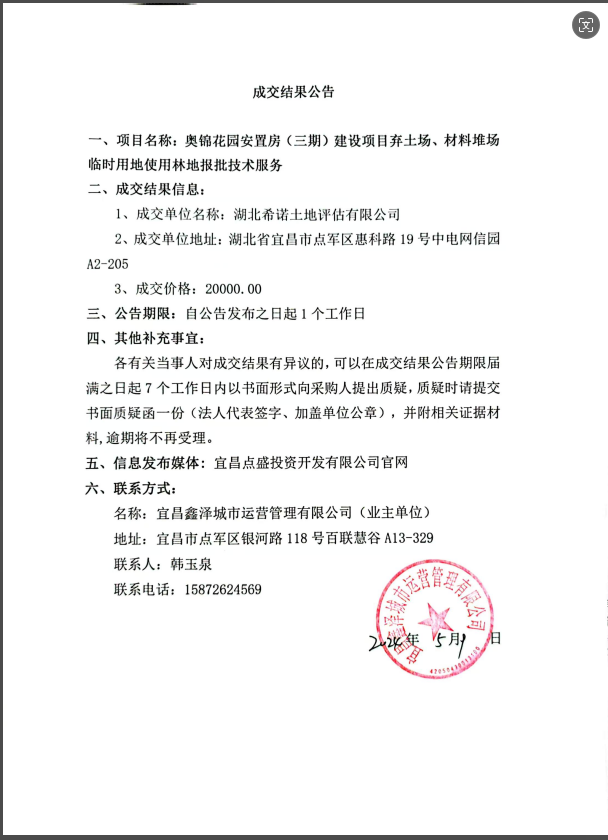 奧錦花園安置房(三期)建設項目棄土場、材料堆場臨時用地使用林地報批技術服務成交公告