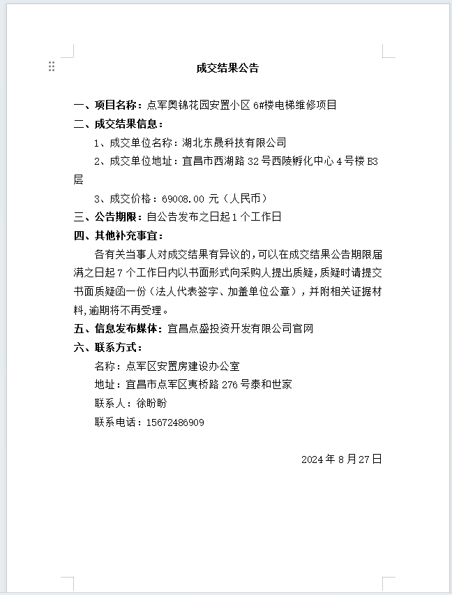 點軍奧錦花園安置小區6#樓電梯維修項目成交公告