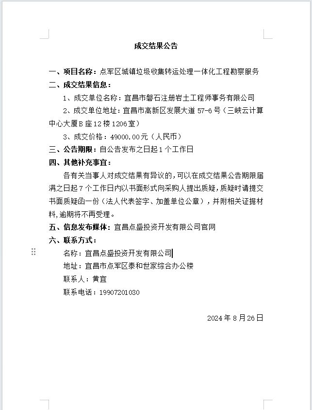 點軍區城鎮垃圾收集轉運處理一體化工程勘察服務成交公告