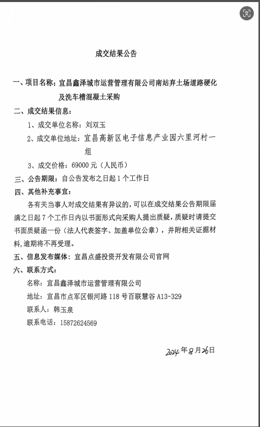 宜昌鑫澤城市運營管理有限公司南站棄土場道路硬化及洗車槽混凝土采購項目成交公告