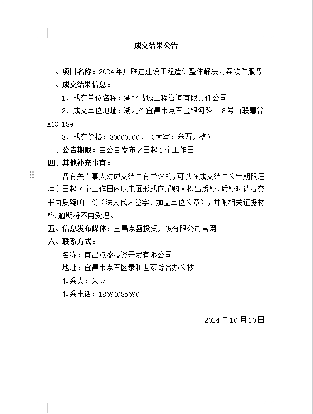 2024年廣聯達建設工程造價整體解決方案軟件服務成交公告