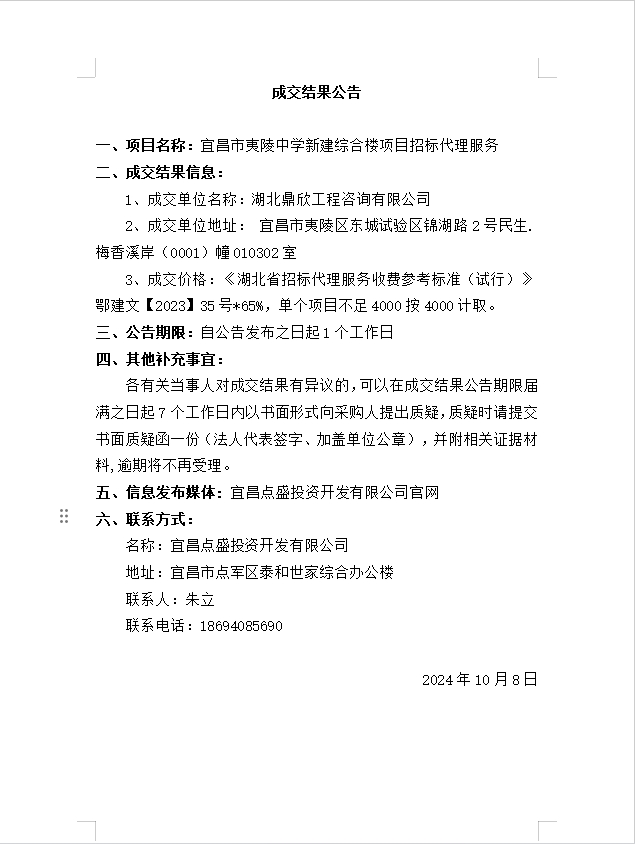 宜昌市夷陵中學新建綜合樓項目招標代理服務成交公告