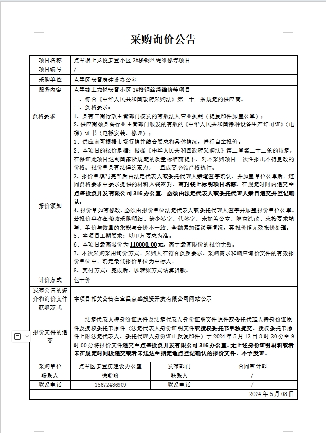 點軍塘上龍悅安置小區3#樓鋼絲繩維修等項目詢價公告