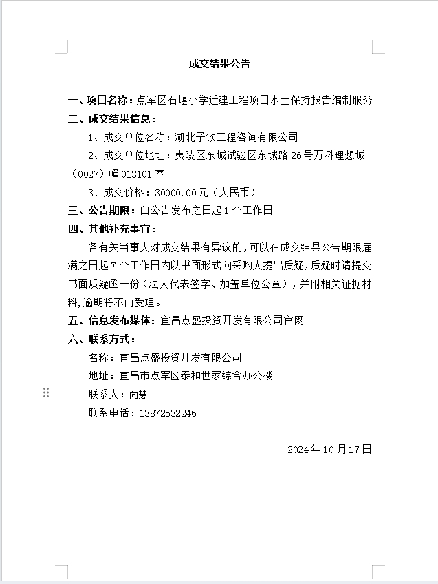 點軍區石堰小學遷建工程項目水土保持報告編制服務成交公告