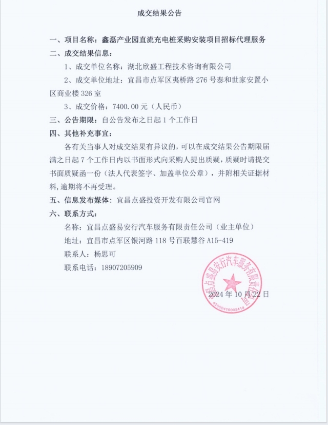 鑫磊產業園直流充電樁采購安裝項目招標代理服務成交公告