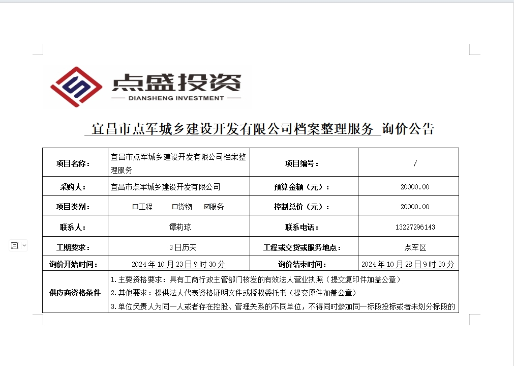 宜昌市點軍城鄉建設開發有限公司檔案整理服務詢價公告