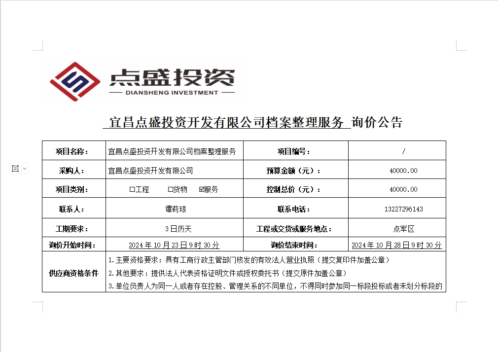 宜昌點盛投資開發有限公司檔案整理服務詢價公告